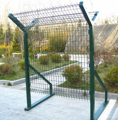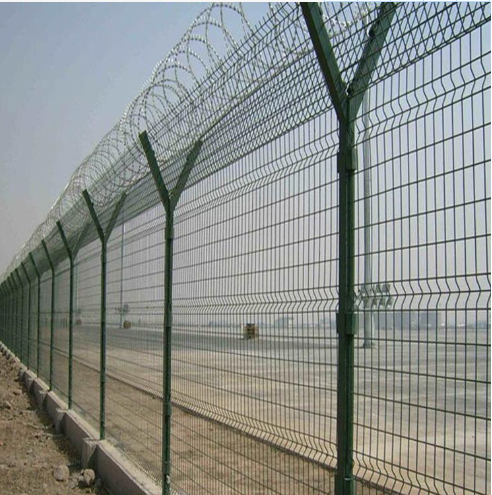 The fence is composed of mesh panel, small V-shaped panel, Y post and razor barbed wire on the top, it usualle has 3 or 4 folders on the mesh panel to make the panel stronger.